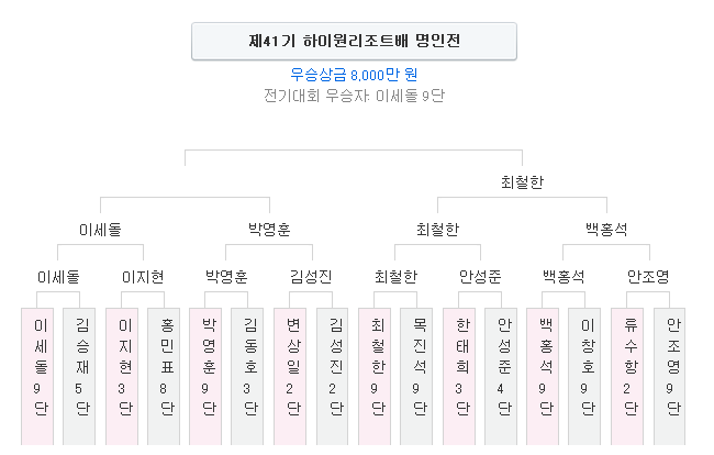 --'毒蛇'というニックネームを持つチェ・チョルハンと'石の拳'というニックネームを持つペクホンソク. 名前だけでも興味を誘発させるインファイター間の対決でチェ・チョルハンが勝利した。双方攻撃的な手を駆使して一寸先を見通すのが難しい攻防. しかしひと勝負の運命を左右するほどの接戦でペクホンソクがギクッとした。 一手近く遊ぶ手を置いてしまったこと。 反面チェ・チョルハンの読み取りは鋭かった。