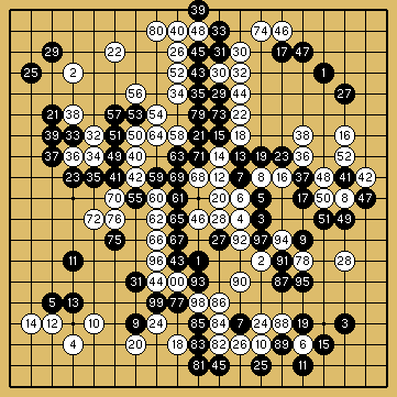 棋譜再生2013三星火災杯準決勝戦3回戦最終局○イ・セドル9段(韓国) vs ●ウークァンア6段(中国)結果:イ・セドル、152手白中押し勝ち序盤は白が若干重い布石で出発は大いによくなかった。 黒31が余計な手であり白42は緩い手と見える。黒59が変だった。 78時点で白が若干良い流れになった。97が無理で96の隣に連結したら長い勝負であった。黒が捉えに行ってかえって有家無家で皆死んで勝負が終わってしまった。<총평=박승철 7단>