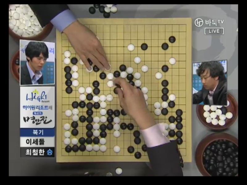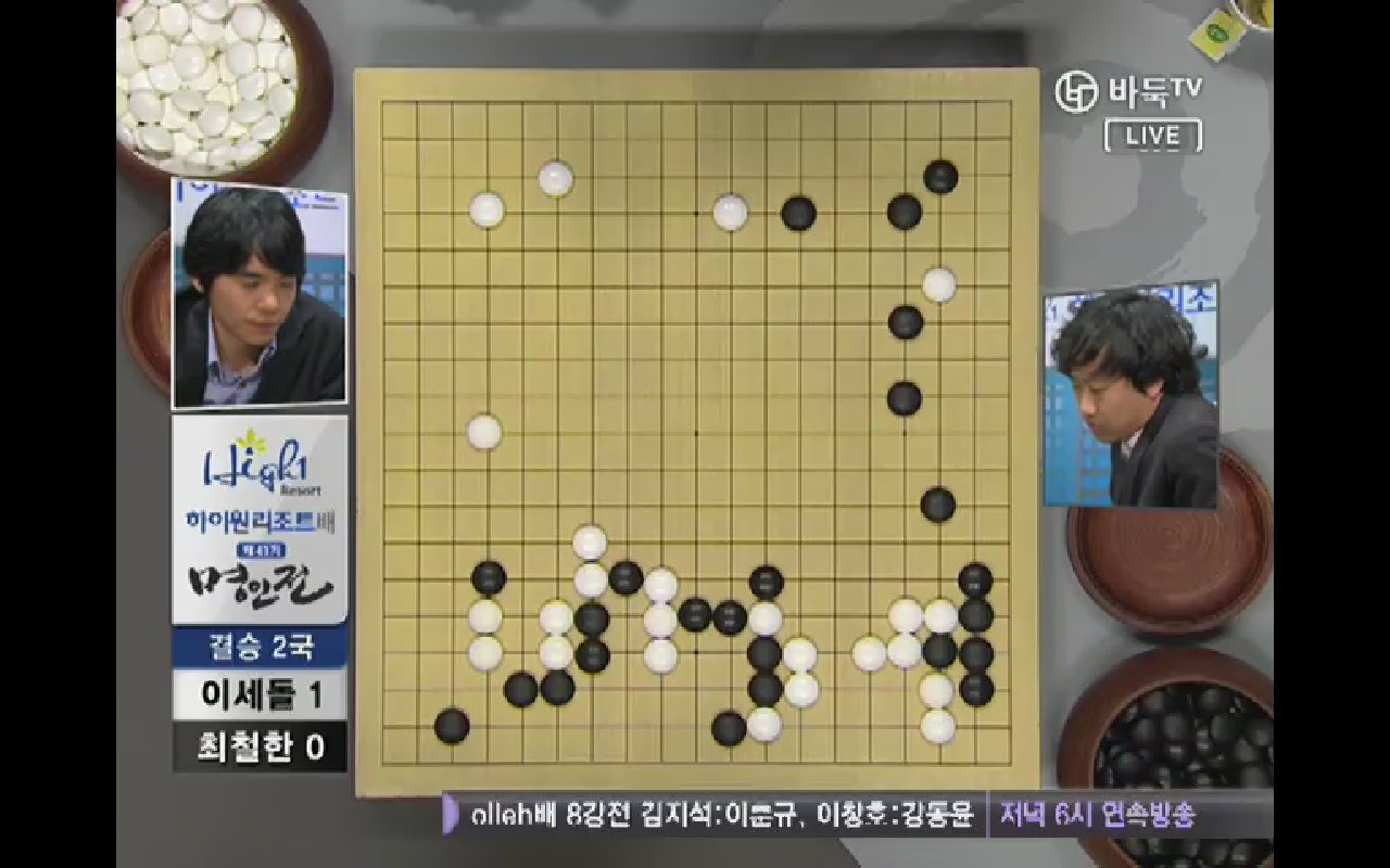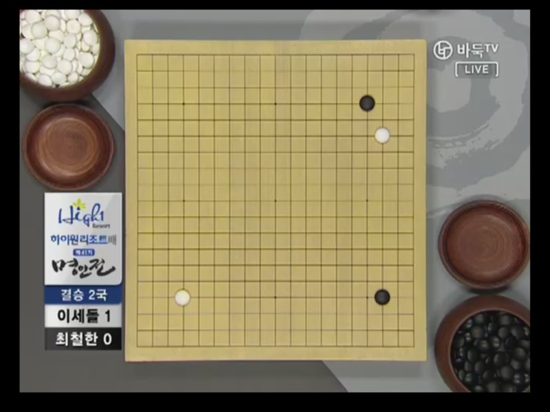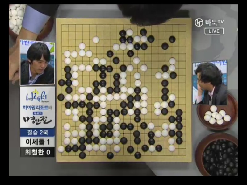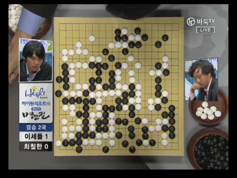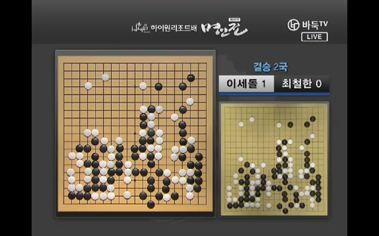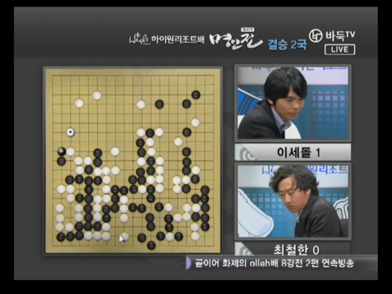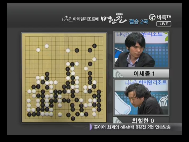 ●チェ・チョルハン9段vs ○イ・セドル9段結果:チェ・チョルハン、197手黒中押し勝ちチェ・チョルハンの実利とイ・セドルの発展性で出発. 1局の時普段と違った新鮮な着手を見せたイ・セドルは2局では空き隅を占めないで直ちにかかっていく事から独特の序盤を設計した。