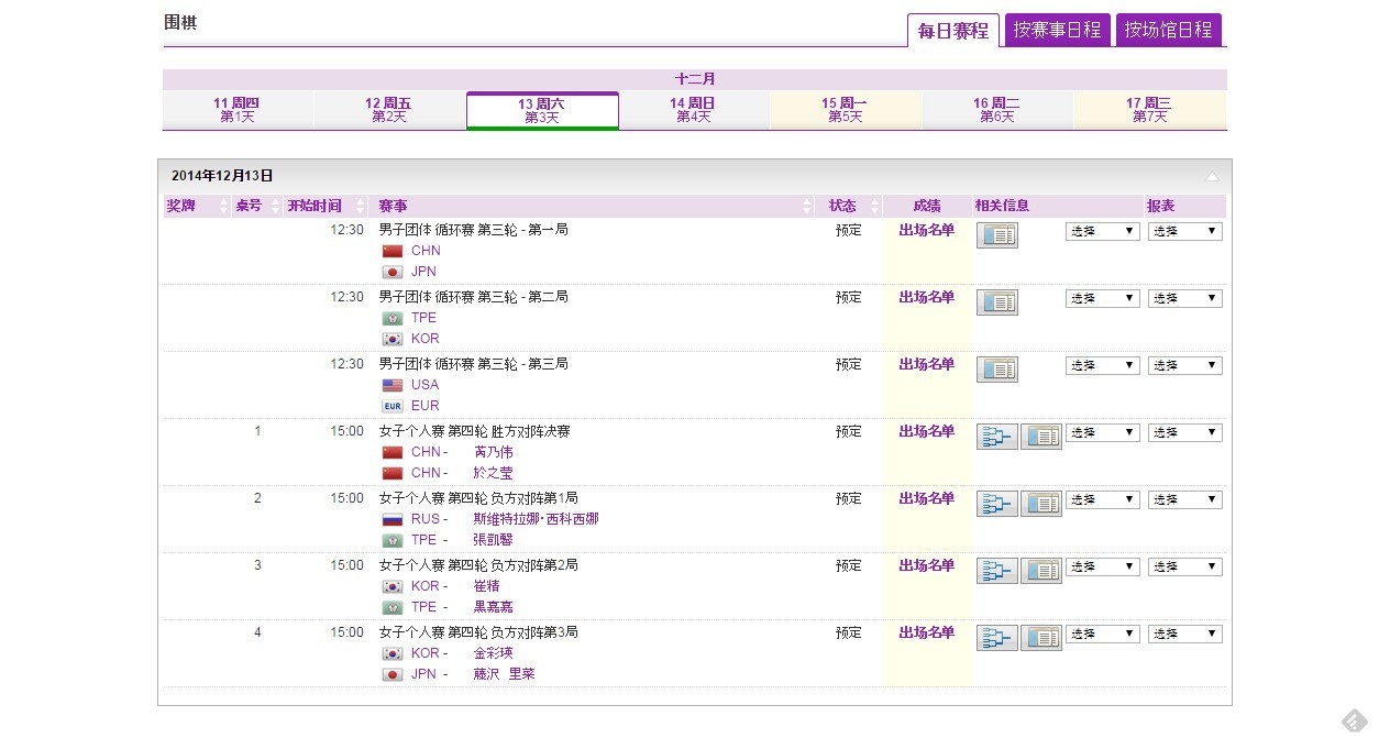 12月13日将继续进行男团第三轮的比赛,对阵为:中国VS日本,中华台北VS韩国,美国VS欧洲,弈城网将继续直播。(曲江 图片来自新浪体育)