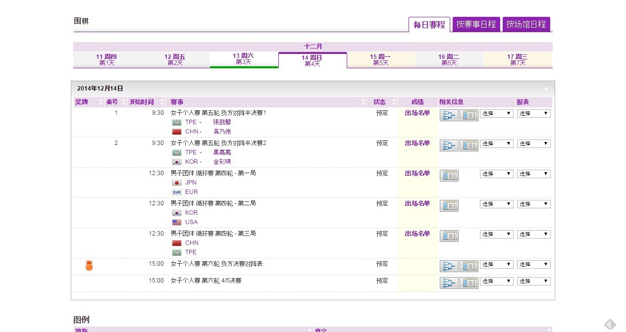 Info System: 日程 / 每日赛程 (围棋, 2014年12月14日 (星期日))男团第三轮战报: