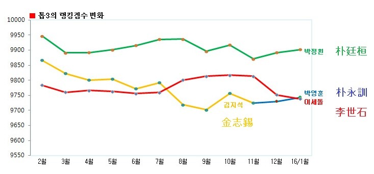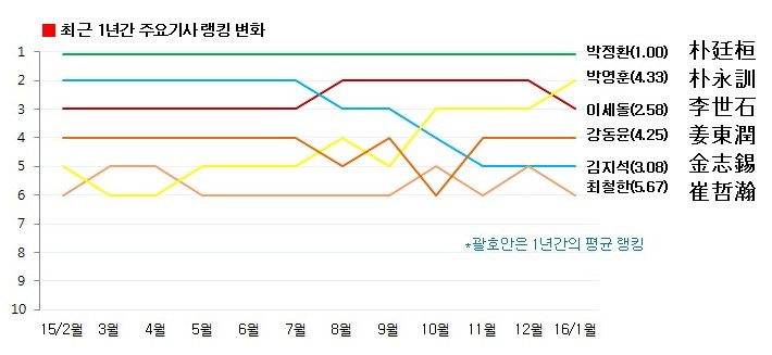 1月韓国ランキング…パク・ジョンファン、26ヶ月連続1位パク・ヨンフン2位に上昇、イ・セドルは3位に下落不動のトップランカーパク・ジョンファンが新年に入って初めて発表されたランキングでも揺るぎない1位を占めた。 パク・ジョンファンは5日韓国棋院が発表した2016年1月ランキングでランキング点数9902点で1位を守った。連続1位は26ヶ月、個人通算1位回数は35回に増えた。 パク・ジョンファンは2012年6月ランキングで初めて1位に上がったことがあって、その後イ・セドルに1位を渡したりもして2013年12月ランキングで再び訪れた1位を2年超えて守っている。 去る12月一ケ月間11勝3敗をおさめてランキング点数を10点上げた。2位パク・ヨンフン(8勝2敗)とは159点差. 1-2位間の点差は先月の140点から少し広がった。 一方パク・ヨンフンのランキングはイ・セドル(8勝5敗)と席を交換をして一段上がった。パク・ヨンフンの2位はランキング制が施行された以後ちょうど一度あった2010年7月ランキングに続く二回目で、5年6ヶ月ぶりだ。 昨年10月ランキングでは3年5ヶ月ぶりに3位を取り戻したことがある。 反面イ・セドルは6ヶ月ぶりに3位に降りて行った。この他に4位カン・ドンユンと5位キム・ジソクは先月のランキングを維持し、チェ・チョルハンは共同5位から一段落ちた。 9位までも先月と同一の中でイ・ドンフンが三階段引き上げて共同9位にジャンプした。女流棋士のランキングはチェ・ジョン(3勝2敗)が26ヶ月連続1位を占めた。 男女を合わせた全体ランキングでは82位に三階段降りて行った。 女流棋士中で100位圏にはチェ・ジョンだけがランクされた。去る2005年8月最初の施行された韓国ランキングは2008年1月一次的に修正・補完したのに続き2009年1月から再びアップグレードされた新しいランキング制を毎月初めに発表している。 算定された韓国ランキングは世界大会出場資格などの根幹とする。