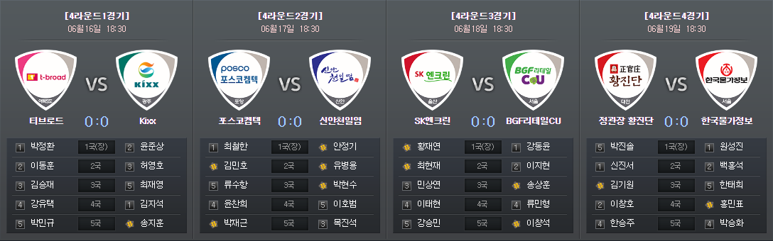 原文記事:HANGAME[囲碁リーグ]中国乙級リーグ変数… KBリーグ4ラウンド オーダー■ 2016 KB囲碁リーグ4ラウンド オーダー2016 KB国民銀行囲碁リーグは今週4ラウンドを行う。チーム対戦はTブロード-キックス(16日)、ポスコケムテック-新安天日塩(17日)、SKエンクリン-BGFリテールCU(18日)、正官庄-韓国物価情報(19日)。今回のラウンドと次のラウンドはKBリーグ選手たちが中国乙級リーグ(15~26日)に大挙12人(1部リーグ11人、2部リーグ1人)が参加することによって多くのチームから主戦が抜けた中で試合をおこなう。 新安天日塩は1指名イ・セドル、2指名チョ・ハンスン、4指名シン・ミンジュンがオーダーから除外された。この外にSKエンクリンは1指名パク・ヨンフンと2指名アン・ソンジュン、ポスコケムテックは2指名ナ・ヒョンと3指名ビョン・サンイル、BGFリテールCUは2指名イ・ジヒョンと5指名チェ・ジョンが戦力から抜けた。 また、正官庄は3指名キム・ミョンフン、韓国物価情報は3指名アン・ククヒョンが乙級リーグに出場する。 1部リーガーに代わって3ラウンドに登場する2部リーガーは12人に達する。