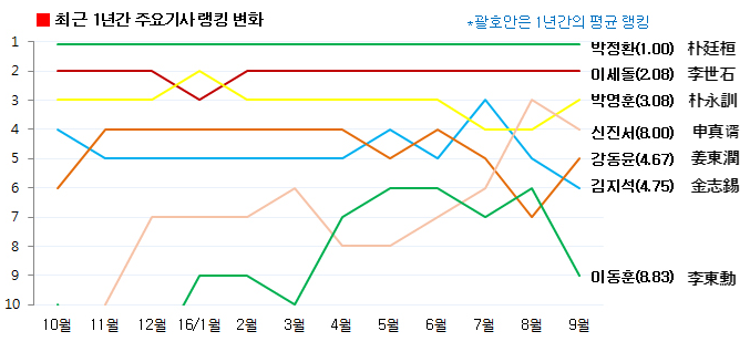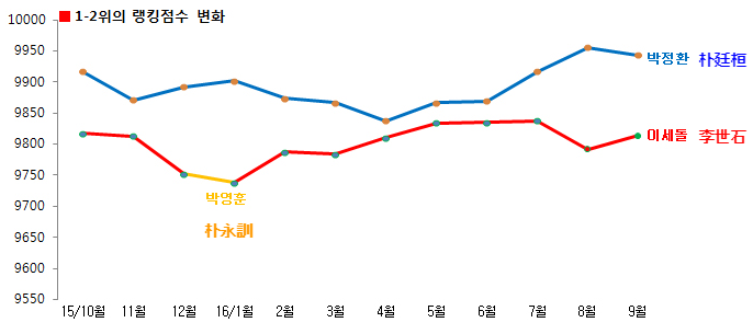 原文記事:HANGAME[韓国ランキング]パク・ジョンファン、34ヶ月連続ランキング1位疾走▲パク・ジョンファン9段(23)が連続1位回数を34ヶ月に増やした。 2013年12月ランキングから始まった不動の連続1位だ。9月韓国ランキング…パク・ジョンファン、34ヶ月連続1位女流1位チェ・ジョン、全体54位で自身の最高'不動のトップランカー'パク・ジョンファン9段が連続1位回数を34ヶ月に増やした。 パク・ジョンファンは5日韓国棋院が発表した2016年9月ランキングでランキング点数9943点で1位を占めた。 8月一月間4勝2敗をおさめたが13点下落した。連続1位は、3月ランキングでイ・セドル9段が持っていた27ヶ月を更新し、毎月自身の記録を広めている。 今年に入って2位との点差は1月159点、2月87点、3月83点、4月28点、5月33点、6月34点。 7月79点、8月164点、9月129点だ。2位にはイ・セドル9段が8ヶ月連続位置した。 8月に4勝1敗で22点を取得した。 パク・ジョンファンとの格差は相変らず大きい。 3勝をおさめたパク・ヨンフン9段は2勝3敗に終わったシン・ジンソ6段を抜いて3ヶ月で再び3位を訪れた。 パク・ヨンフンが9699点、シン・ジンソが9698点で1点差。 パク・ヨンフンは24点上がりシン・ジンソは10点落ちた。10位圏ではカン・ドンユン9段(4勝1敗)が5位に二階段上がりキム・ジソク9段(1勝2敗)は6位に一段降りて行った。 アン・ソンジュン6段(3勝)とウォン・ソンジン9段(3勝3敗)も一階段ずつ上がってそれぞれ7位と8位にランクされた。この外にイ・ドンフン8段(3敗)は9位に三階段落ちた。 チェ・チョルハン9段(3勝)はビョン・サンイル5段(2勝1敗)を11位に押し出して3ヶ月ぶりに10位圏に再進入した。女流棋士のランキングはチェ・ジョン6段が11勝2敗で活躍してランキング点数は39点、順位は三階段引き上げた。 今年に入って一ケ月間で10勝以上をおさめた棋士はチェ・ジョンが唯一だ。 男女を合わせた全体ランキングも先月より三階段上がった54位。 自身の最高ランキングだ。2005年8月初めて施行された韓国ランキングは2008年1月一次的に修正・補完したのに続き2009年1月から再びアップグレードされた新しいランキング制を毎月初めに発表している。 算定された韓国ランキングは世界大会出場資格などの根幹とする。