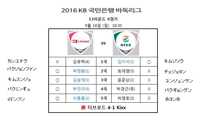 ▲パク・ジョンファンは勝利インタビューで"これまでかなり出てこれなくて申し訳なかった。 これからチームの助けになるように努力する"という話で残りの期間全力投球するという意を表わした。 前半期の不振を4連勝できれいに洗い落としたキム・スンジェは"今からが開始だ"という言葉で3連続優勝に対する期待感を表わすことも。一方この日(18日)夜開かれたKBリーグ13ラウンド3試合でTブロードは崖っぷち背水の陣を敷いたKixxを4-1で完勝した。 パク・ジョンファンの先制点にキム・スンジェの決定的な追加点が続いて、ほとんど同時に終わった後半早碁戦二対局まで全て席巻した。 Kixxは長碁対局で主将キム・ジソクが勝利したのが唯一の勝点。6勝6敗で5割勝率に復帰したTブロードは順位を4位に引き上げてポストシーズンに向かった意味ある始動をした。 直前の新安天日塩との試合に続き連続して4-1勝ちを勝ち取ってチームの雰囲気も見違えるように明るくなった。 前半期2勝6敗で大きく振るわなかったキム・スンジェが後半に入って大きく生き返って、2指名イ・ドンフンもホ・ヨンホを破って自分の役割をする姿だった。▲TブロードもKixxも共に勝負所で見た3局。 国家代表チームの事前予想は55:45程度でユン・ジュンサンの優勢だったが結果はキム・スンジェのすっきりした勝利であった。反面昨年4位チームKixxは絶体絶命の勝負で敗れて4勝8敗、ポストシーズン脱落が事実上決定された。 残った希望は残余4試合を全て勝った後を見守ることなのだが後半に入って4連敗にあうなどチームの雰囲気が沈むだけ沈んで可能だと思わない。かくして最後の決戦の開始という13ラウンドが幕を下ろした。 混沌の極を走ったリーグ構図がひとまず3強体制で整理された中で焦眉の関心事は4強戦いの残った一つの席をどのチームが占めるのかだ。 ひとまずTブロードが先行獲得を叫んだ状況だが5勝の他の三チームがそのまま座って見守るはずがない。 他の見方をすれば今からが開始で、本当に勝負ということができる。朝夕の涼しい天気が秋祭りが遠くないことを教えている2016 KB国民銀行囲碁リーグは来週木曜日(22日) Kixx-新安天日塩の試合を始まりに14ラウンドの幕を上げる。 ポストシーズンの成績により決まるチーム賞金は1位2億ウォン、2位1億ウォン、3位6000万ウォン、4位3000万ウォン。 賞金とは別に毎対局勝者は350万ウォン、敗者は60万ウォンを受ける。▲最終局はホ・ヨンホを相手にしたイ・ドンフンの捨て石作戦があきれたという評価を受けた。 (写真右側から)試合終了後Kixxチーム主将キム・ジソクとユン・ジュンサン、キム・キヨンなど主力選手たちがスタジオに入ってきて事実上脱落の物足りなさを分けている。▲Tブロードの4位入城はトップグループ三チーム(正官庄、ポスコケムテック、SKエンクリン)にメガトン級台風の北上ぐらい恐ろしいニュースといえる。 Tブロード イ・サンフン監督(右側)は"皆とても警戒するようですね"とぶっきらぼうな話ぶりをしながら"3連続優勝はなかなか見られないということでしょう"と意味深長な微笑を浮かべた。