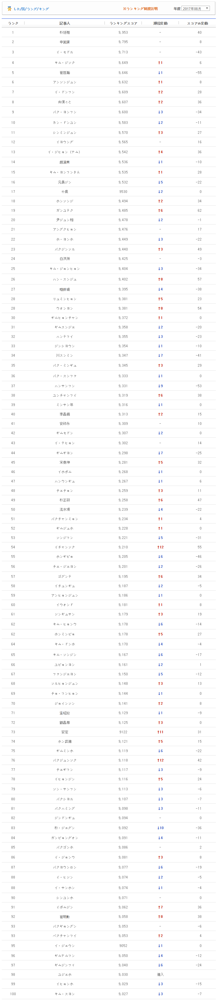 2位 シン・ジンソ3位 オ・ユジン4位 パク・ヨンフン5位 チェ・ジョン6位 アン・グクヒョン7位 イ・セドル8位 イ・ヨング9位 チェ・チョルハン10位 チョ・ハンスン
